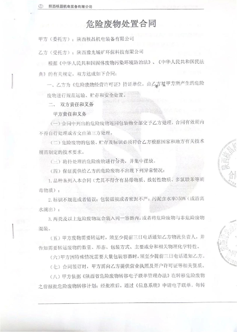 我公司屬于機(jī)電一體化、機(jī)械加工等產(chǎn)業(yè)的生產(chǎn)經(jīng)營(yíng)企業(yè),現(xiàn)階段主要的危險(xiǎn)廢物包括:油漆桶、廢機(jī)油、乳化液、噴漆、噴砂、油漆桶、廢機(jī)油、乳化液等危險(xiǎn)廢物,處置由陜西豫光城礦環(huán)??萍加邢薰境薪愚D(zhuǎn)運(yùn)及處理。噴漆、噴砂房等由公司投入大量資金進(jìn)行升級(jí)改造,在經(jīng)營(yíng)活動(dòng)中加強(qiáng)職工環(huán)保培訓(xùn),不斷提升職工環(huán)保意識(shí)。經(jīng)陜西中天環(huán)保有限公司監(jiān)測(cè),所排廢氣均達(dá)到國家標(biāo)準(zhǔn),為改善環(huán)境、大氣質(zhì)量作出積極的貢獻(xiàn)。