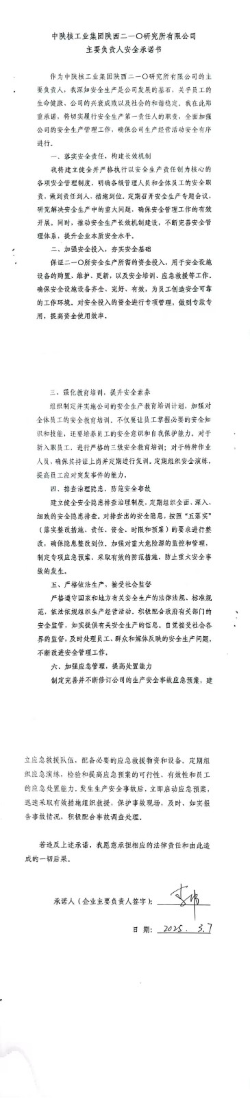 中陜核工業(yè)集團陜西二一〇研究有限公司主要負責(zé)人安全承諾書